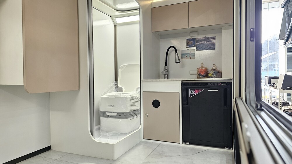 HPM 친환경 하드코팅 가구(안티스크래치), 상부수납장, 대형수납장, 유럽 템바도어, 독립 화장실 부스, 욕실 전용 바닥, 인조대리석 싱크상판 + 싱크볼 + 수전, DC 물펌프, 샤워기, 전기 통합 컨트롤보드, 220V 외부 인입, 누전차단기, 휴즈블럭, 실내 12V 시가소켓(2개), 실내 220V 콘센트(2개), LED 간접조명, LED 메인등, LED 욕실등, 차량용 소화기, 일산화탄소(CO) 경보기