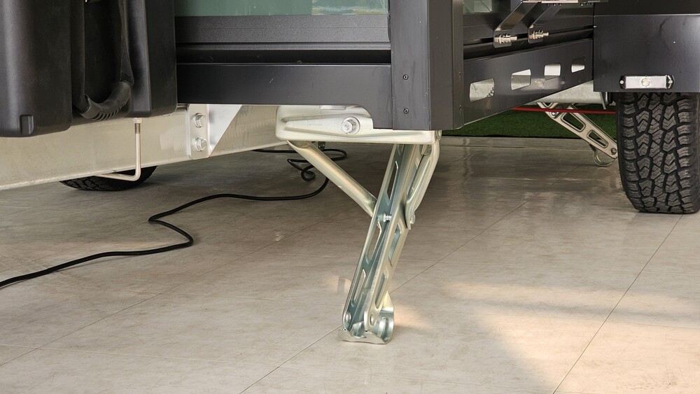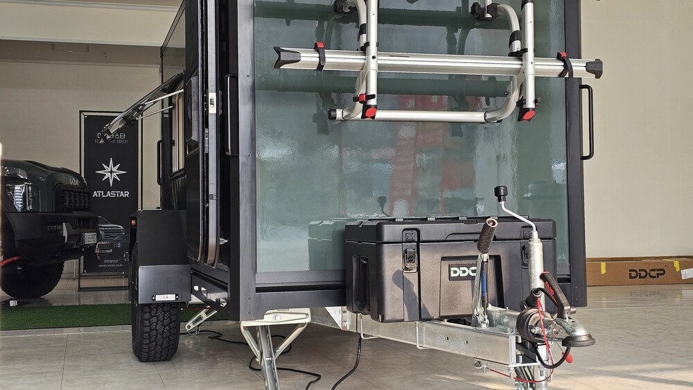 독일 AL-KO社 고하중 액슬(1,350kg), AL-KO社관성브레이크, AL-KO社커플러, 고하중 랜딩기어 & 클램프, 4점식 고하중 아웃트리거, 용융아연도금 A 프레임, 15인치 자동차전용 알루미늄 휠, A/T 타이어 LT215/75R15, GRP 패널(고밀도 단열재), 알루미늄/SUS몰딩, 휠하우스, 머드가드, 미국식 카라반 도어(번호키), 대형후방도어 1100×1000, 카라반 창문 900×550(2개), 전면박스 76L, 알루미늄 외부 핸들(4개), 220V 외부 인입, 유럽형 FULL LED 등화장치, 보조제동등, 번호판등, 차폭등, 후면반사기, 측면반사기