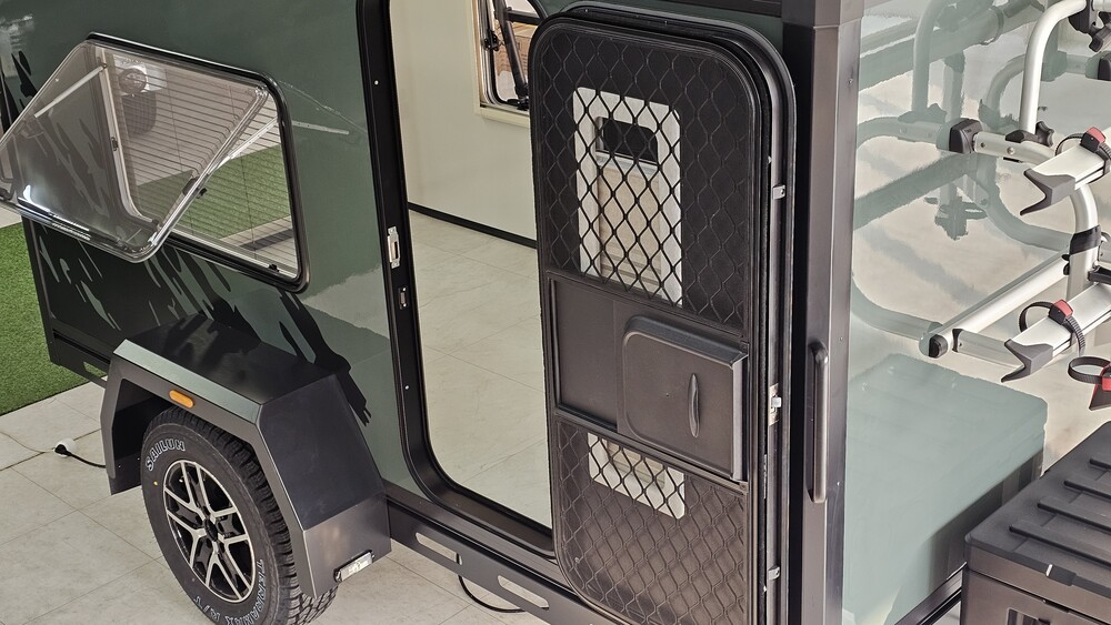 미국식 카라반도어(번호키)를 기본으로 하고, 캠핑시 많은 짐을 편안하게 넣고 뺄 수 있도록 후면에 대형 서비스도어를 기본으로 하였습니다.