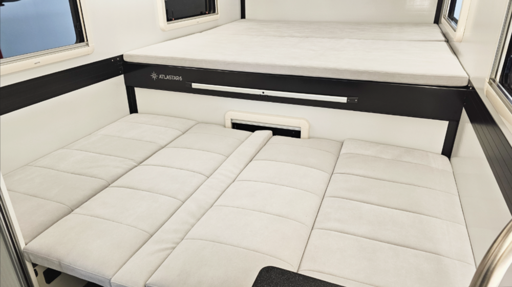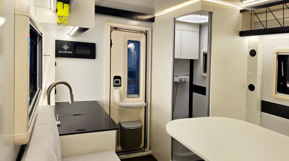 아틀라스타6의 실내는 편하게 사용하고, 넓은 공간감을 느낄 수 있도록 설계했습니다. 벙커의 높이와 침상 규격, 라운지 구성은 체류 시간을 자연스럽게 늘려줍니다.